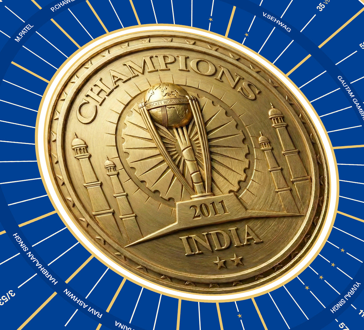 At the centre stands the 2011 ICC World Cup Trophy, rendered with premium embossed treatment and designed like a commemorative championship coin, carrying the mark of “Champions”.