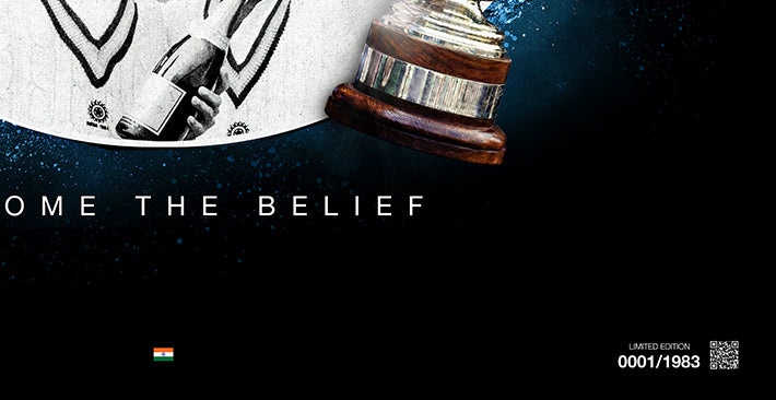 At its centre stands the iconic 1983 World Cup trophy, embossed with special treatment and elevated as the defining symbol of the moment that changed everything.