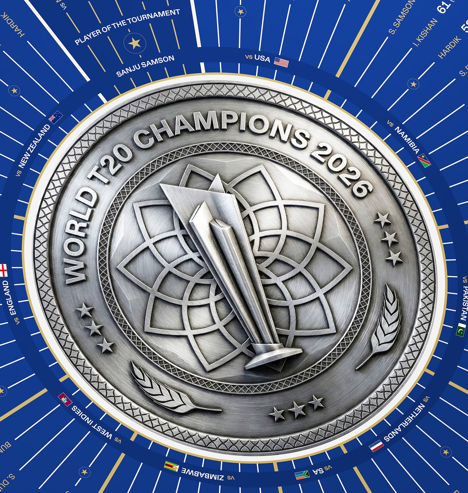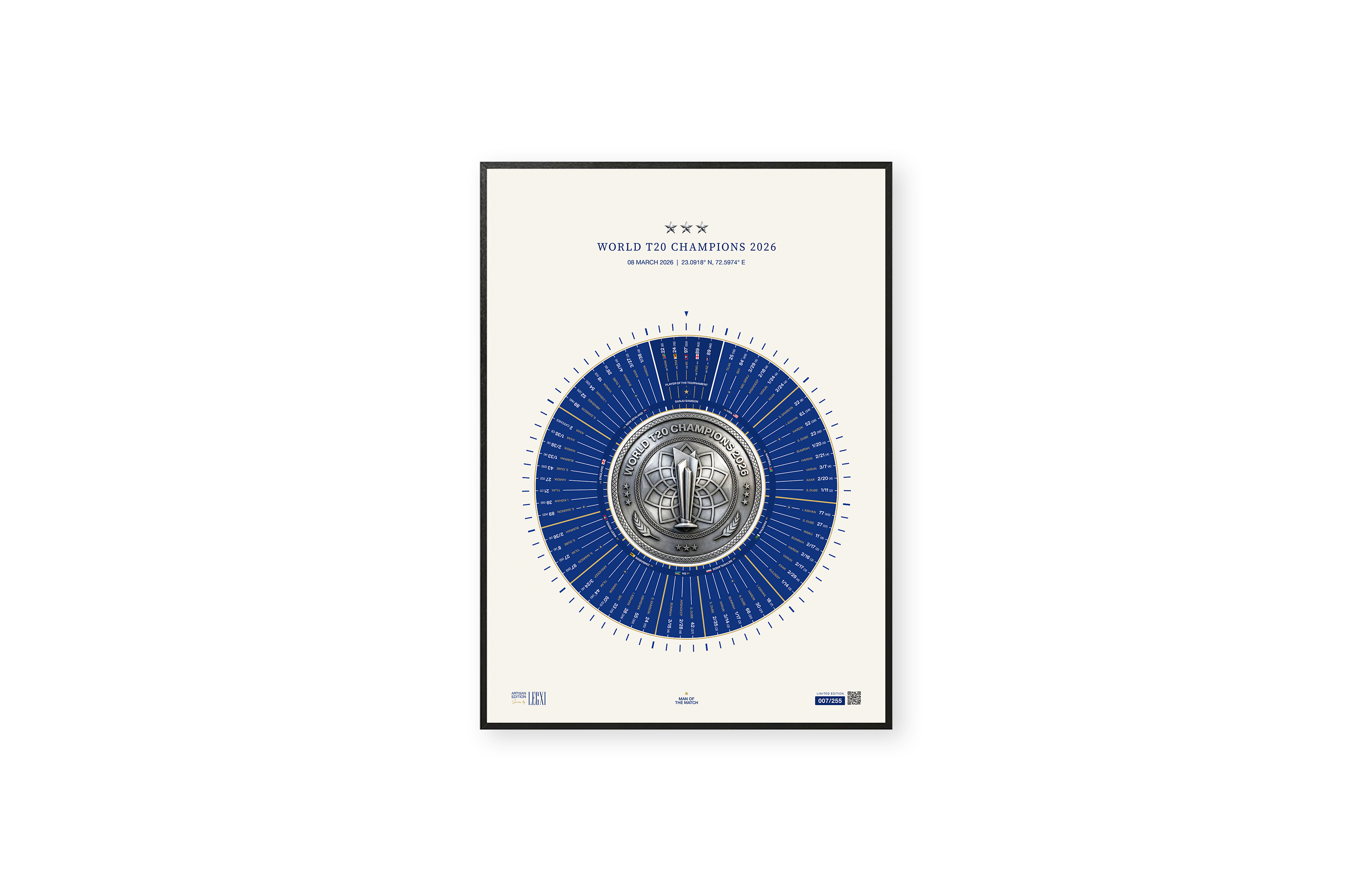 The artwork records India’s entire championship journey through the tournament. Every match, every decisive spell, and the innings that shifted the momentum are structured into a single circular system.