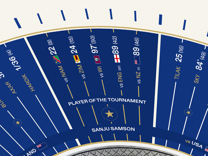 From this centre expands a radial match map documenting India’s path through the tournament.